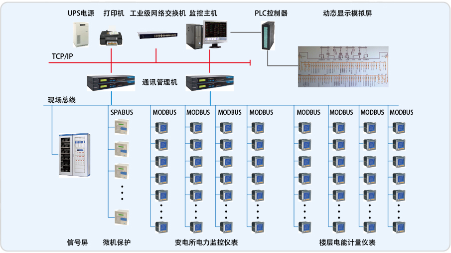 系統(tǒng)組網(wǎng)采用常見的3層結構,站控管理層、通訊管理層和現(xiàn)場設備層。上位機軟件采用Acrel – 2000電力監(jiān)控軟件,通過軟件進行設備配置、數(shù)據(jù)庫變量配置、界面設計等,完成了在上位機軟件監(jiān)控及電力監(jiān)控的功能。具體如下: