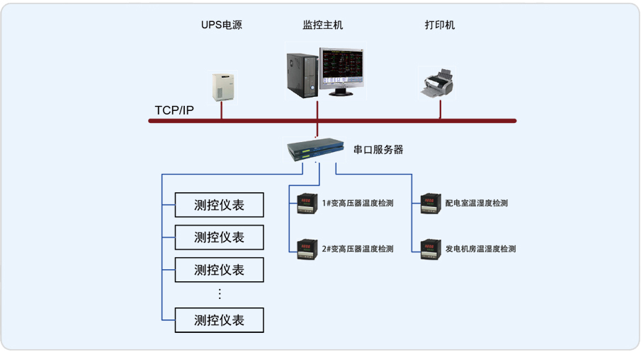 系統主要實現中國建設銀行股份有限公司云南分行本部地下B2變電所的0.4kV配電系統進行用電監(jiān)測與電能管理;監(jiān)測范圍為改造變電所的T1、T2變壓器的饋線柜、母聯柜、電容補償柜,變壓器的相間溫度、配電室和發(fā)電機房的溫濕度,饋線柜和母聯柜側儀表進行遠程實時監(jiān)控和電能管理。該系統總計有29只儀表,分4條總線,都是直接通過屏蔽雙絞線走管道拉至值班室后連接到串口服務器上,實現總線上儀表與監(jiān)控主機的數據連通。
