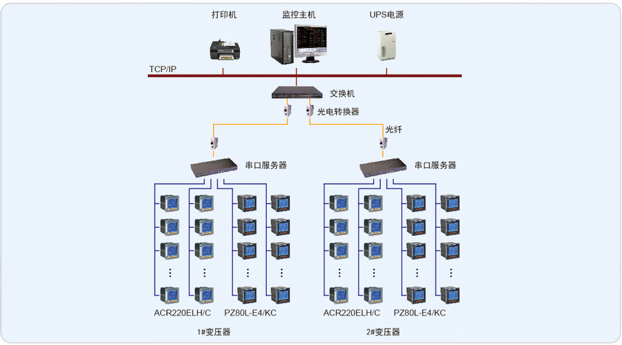 吳淞中心醫院電能管理系統監控范圍變電所內智能儀表的運行參數,吳淞中心醫院共一個變電所,變電所內有2路變壓器(1#變壓器、2#變壓器)出線及93路普通饋線。進線回路采用ACR220ELH多功能諧波儀表,普通饋線回路采用PZ96L-E4/C智能可編程電力儀表。整套電能管理系統站控管理部分包括監控管理主機、打印機、UPS電源等;網絡通訊層部分包括一個16口的串口服務器;現場智能儀表監控設備層由ACR220ELH和PZ96L-E4組成。該配電系統分布在一個變電所內,2臺變壓器的所有電力儀表通過RS485總線連接至串口服務器,并經過超五類網線上傳至監控后臺。