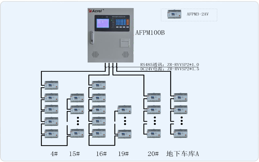 系統(tǒng)組網(wǎng)共分為站控管理層、網(wǎng)絡(luò)通訊層、現(xiàn)場設(shè)備層三層,該項目南區(qū)、北區(qū)各一條通訊總線,監(jiān)控裝置通過總線在樓層配電箱手拉手串接后,接入壁掛式后臺,組成電氣火災(zāi)系統(tǒng)的大動脈。箱體中漏電流互感器通過電流線接入漏電探測器,漏電探測器實時顯示漏電情況,組成一套信號穩(wěn)定,精度可靠的電氣火災(zāi)監(jiān)測系統(tǒng)。