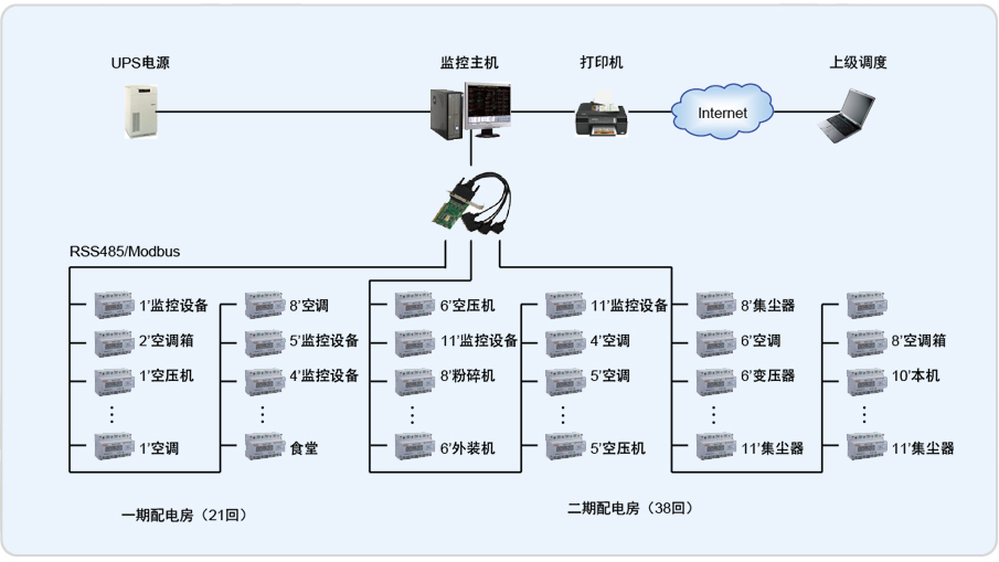 整個系統(tǒng)采用分布式結(jié)構(gòu),監(jiān)控主機位于東區(qū)主辦公室內(nèi),一期配電房和二期配電房采用RS485總線直接接入監(jiān)控主機擴展卡的串口。對于每個回路采用ADL 300-EF/C三相電能表,共59個回路;站控層應用國內(nèi)知名的聯(lián)想商用計算機作為監(jiān)控主機,同時設(shè)有用于報表打印輸出的打印機;防止異常斷電而引發(fā)的數(shù)據(jù)丟失的UPS設(shè)備。監(jiān)控軟件平臺采用單機版Acrel-2000型電力監(jiān)控系統(tǒng)。Acrel-2000型電力監(jiān)控系統(tǒng)預留了擴展接口,可方便進行擴展。