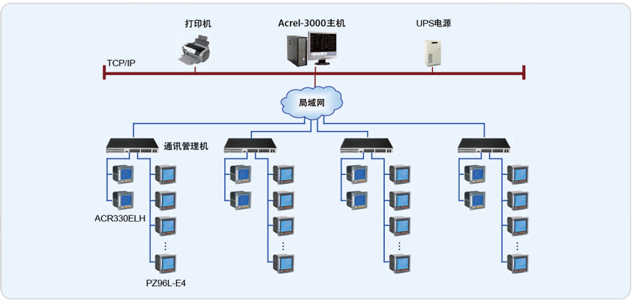 該系統(tǒng)總計(jì)有79只儀表(其中包括8只ACR330ELH諧波儀表,71只PZ系列智能儀表),分8條總線(xiàn),由于四個(gè)變電所之間距離較遠(yuǎn),并且較為分散,采用每個(gè)變電所內(nèi)自行組網(wǎng),然后并入惠氏公司內(nèi)部局域網(wǎng)的方式,實(shí)該現(xiàn)場(chǎng)總線(xiàn)上儀表與監(jiān)控主機(jī)的數(shù)據(jù)連通。