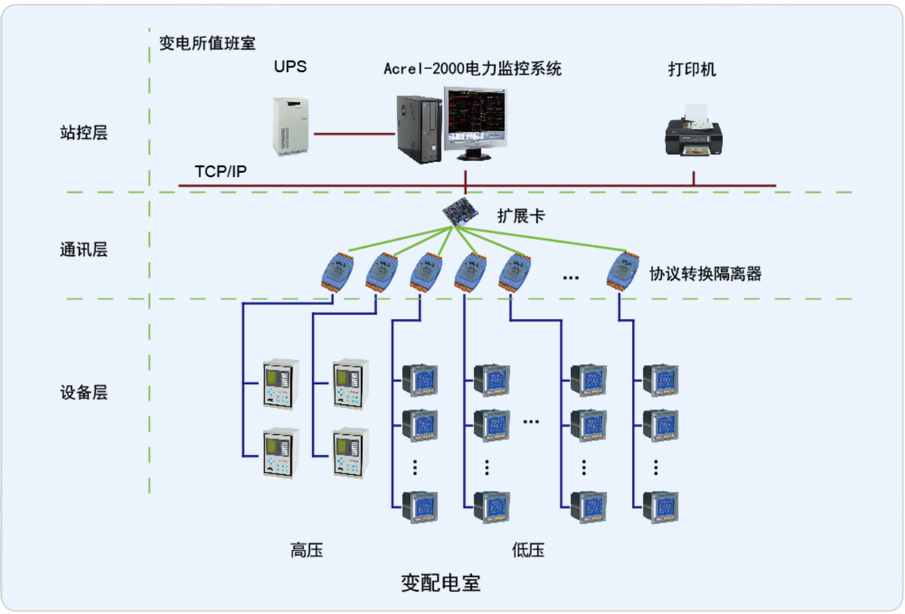 本項(xiàng)目承接其10KV配電增容改造變電所部分電力監(jiān)控系統(tǒng),其中有兩路高壓進(jìn)線,配有綜合保護(hù)裝置,低壓部分,進(jìn)線柜、饋線柜配有儀表。通過Acrel-2000電力監(jiān)控系統(tǒng),實(shí)時(shí)監(jiān)測(cè)變電所內(nèi)各個(gè)回路的電流、電壓、功率、開關(guān)狀態(tài)等電參量,由此達(dá)到變電所少人值守或無人值守的智能化管理。