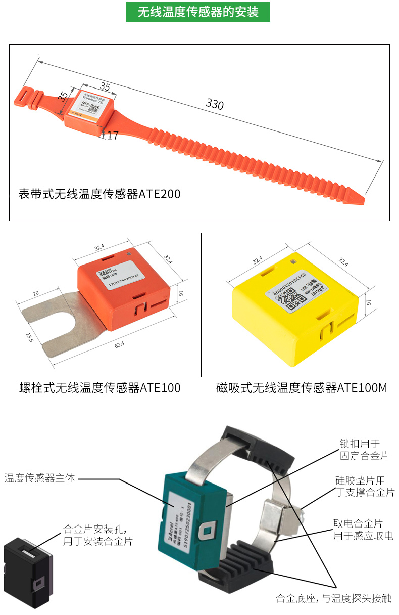 適用于高低壓開(kāi)關(guān)柜內(nèi)電纜接頭、斷路器觸頭、刀閘開(kāi)關(guān)、高壓電纜中間頭、干式變壓器、低壓大電流等設(shè)備的溫度監(jiān)測(cè)。