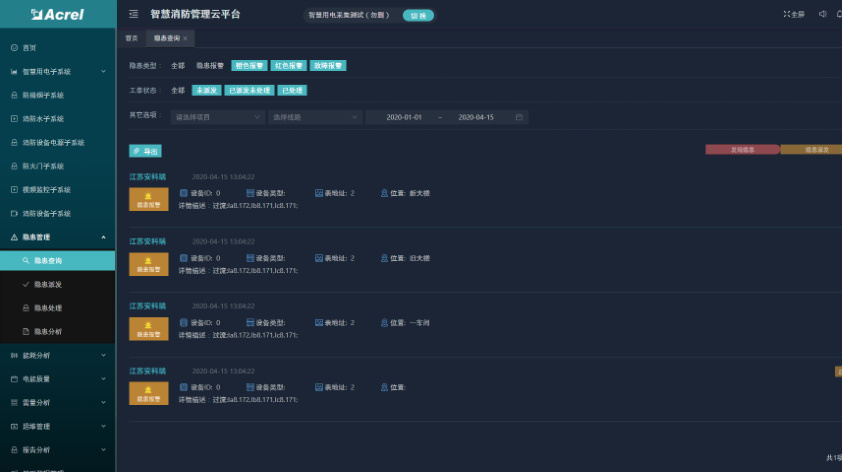 隱患管理功能包括了隱患查詢、隱患派發(fā)、隱患處理和隱患分析四個模塊。可以查看登錄用戶下的所有項目的隱患信息,并進(jìn)行派發(fā)和處理操作,且對所有隱患進(jìn)行統(tǒng)計分析。