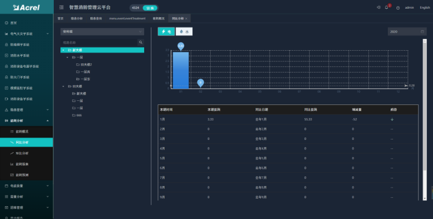 能耗分析功能包括了能耗概況、能耗同比、能耗環(huán)比、能耗報表和能耗預(yù)測等五個模塊??梢圆榭吹卿浻脩粝碌乃许椖?的能耗統(tǒng)計、同環(huán)比和報表,且按日、周、月等維度進(jìn)行能耗預(yù)測分析。