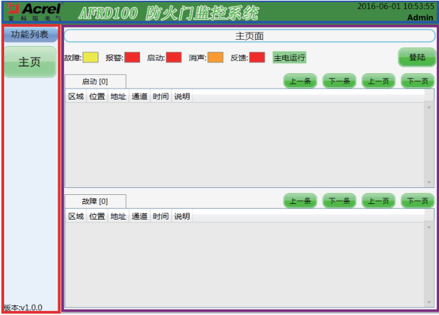 包含“登陸”按鈕、“界面標題”、“功能列表”、“系統狀態欄”四部分組成,可以快速查詢當前監控狀態,也可用于工作人員登錄操作。